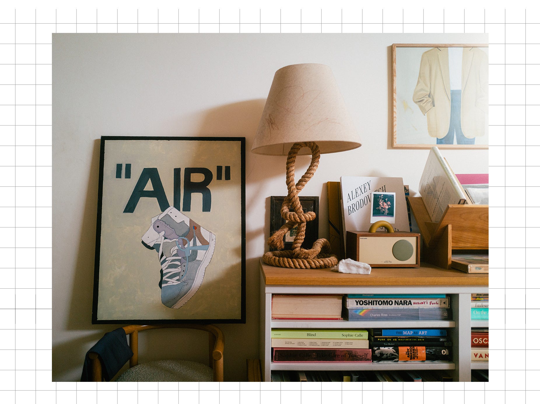I also thrifted this charming painting of Virgil Abloh’s Jordan 1 ad, but alas have no idea who painted it. It’s also awaiting a final destination, currently resting atop a miniature chair in my living room.