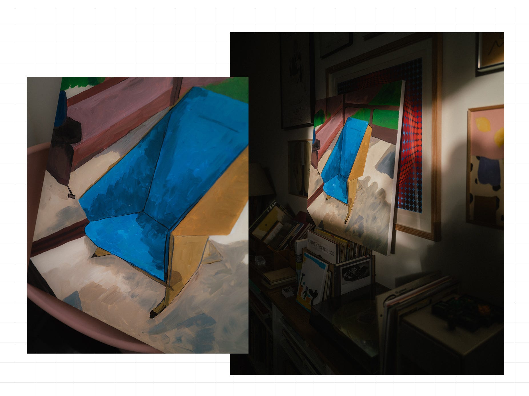 I (finally) finished a new painted study of one of FLW’s Taliesin 1—or “origami”—armchairs. It also had a moment where it was resting on top of some records—maybe you want to give it a new home? It’s 30 x 30 inches, acrylic on canvas.